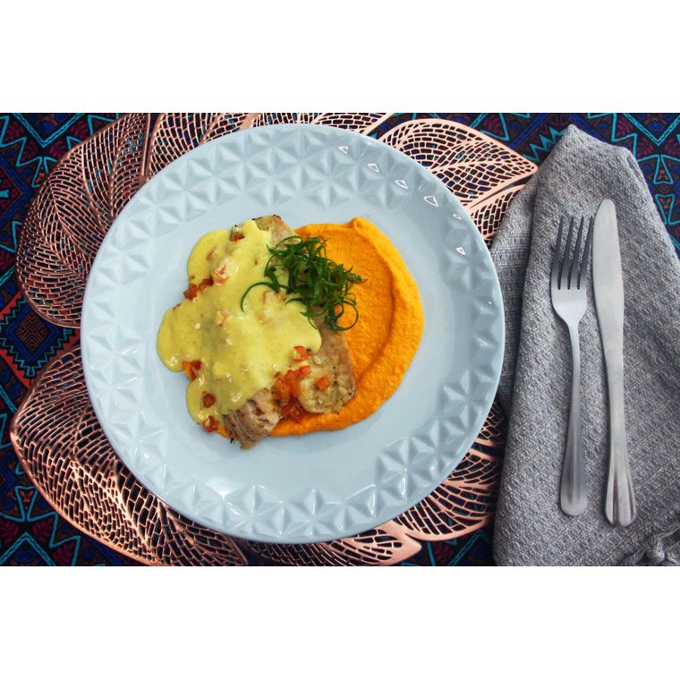 Filé de tilápia macio em molho cremoso e aromático de curry, com purê de cenoura